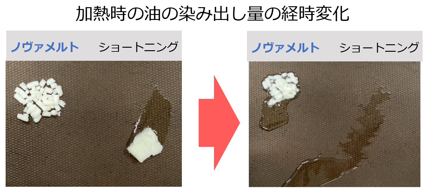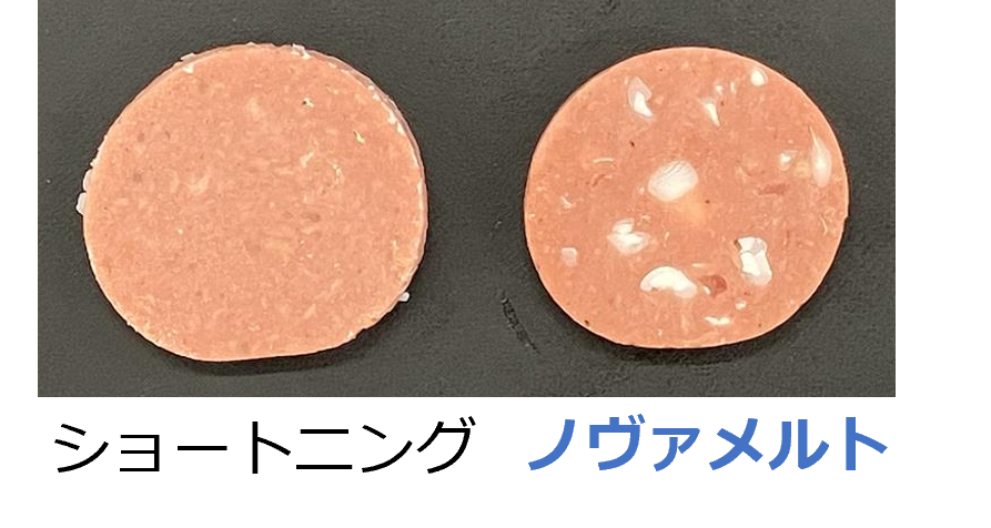 「ノヴァメルト」は、加熱時の油脂の融(と)け出しを制御する独自開発技術(Melting Control技術)により、食品中に油脂の一部を留めさせることで、食品に多汁感や瑞々しさを付与できる食用加工油脂です。